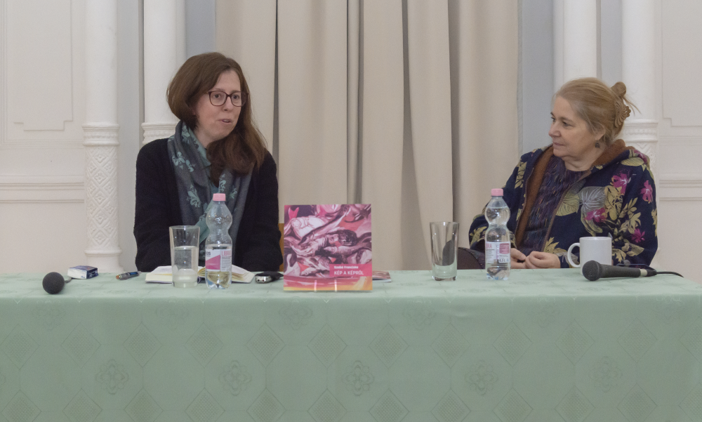 Révész Emese művészettörténész, a katalógus bevezető tanulmányának szerzője. A bemutatót követően Révész Emese kurátori tárlatvezetést tartott.