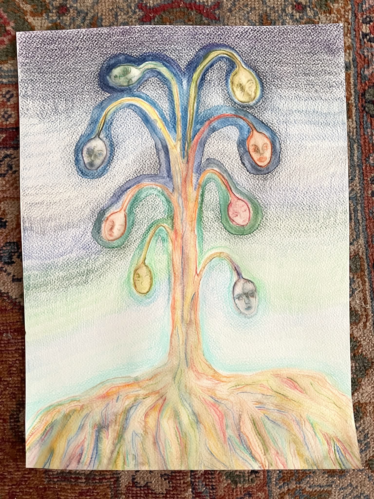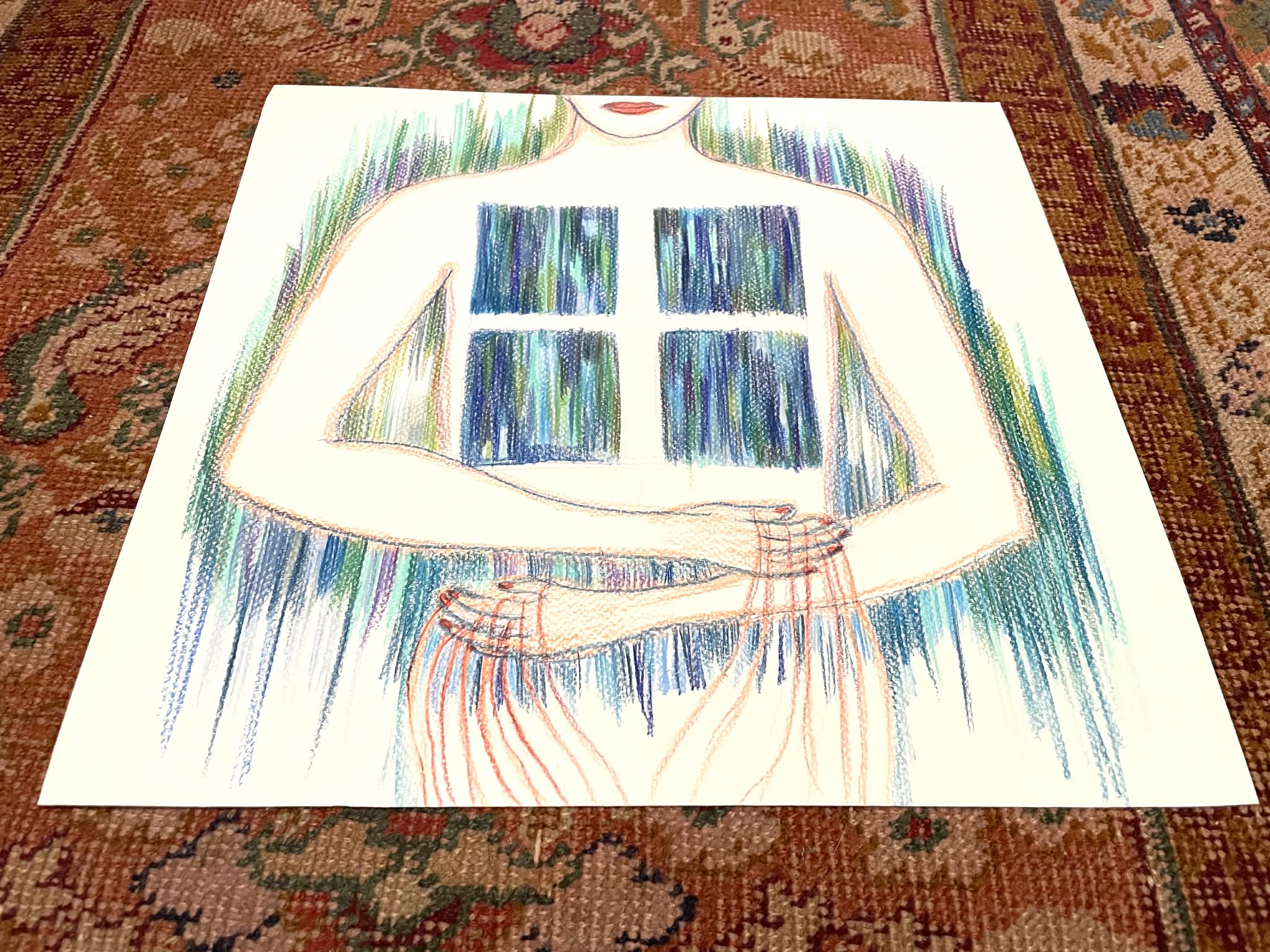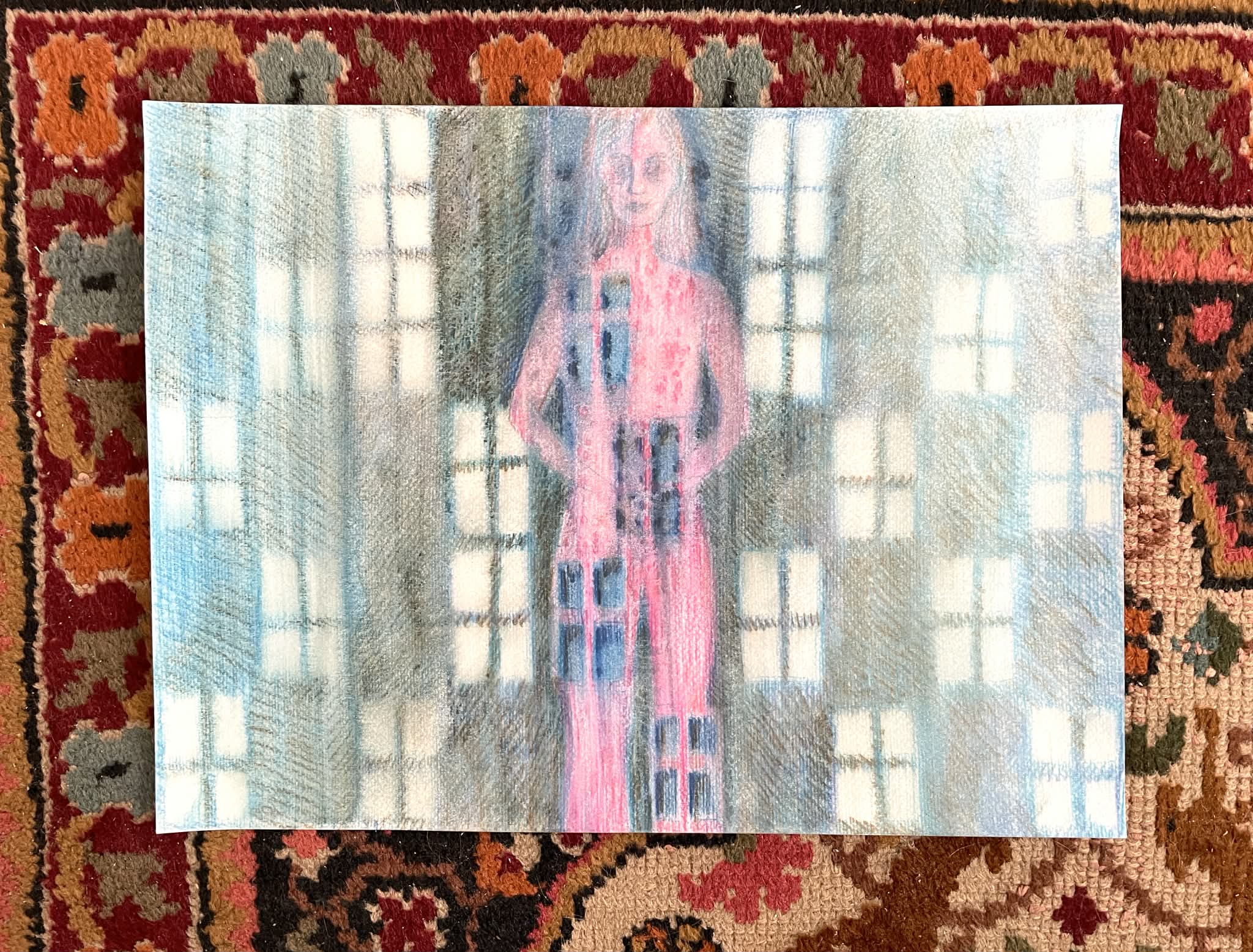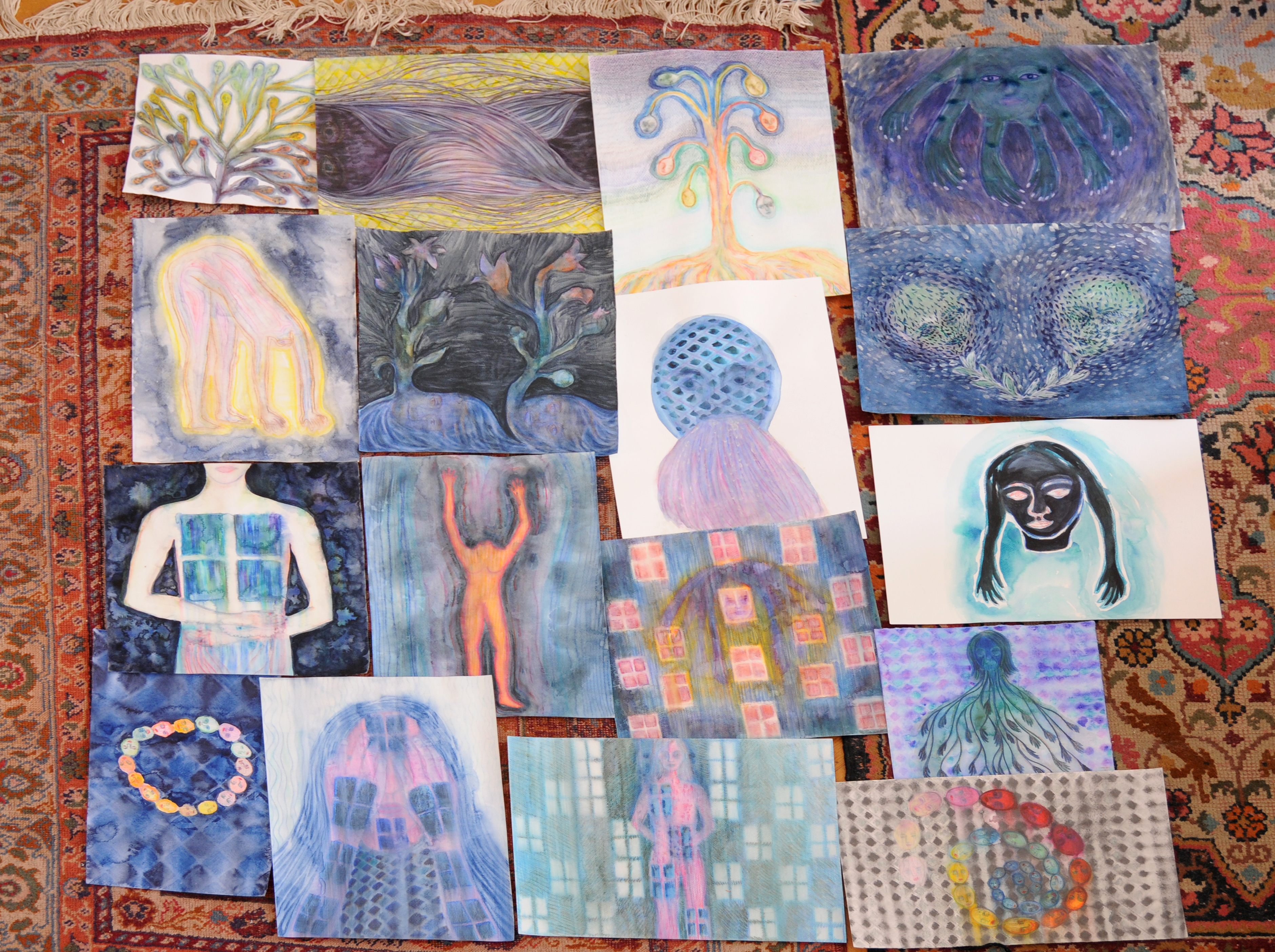 Az utóbbi időben sokat kísérleteztem kicsi, papír alapú képekkel. Arra törekedtem, hogy viszonylag gyorsan és kevés lépésből álljanak össze a festmények (amelyek gyakran talált/hulladéklapokra készültek). Szinte mindegyik munkánál kizárólag akvarellceruzát használtam. Nem applikáltam semmit, nem festettem sok festékréteget a lapokra, gyorsan akartam dolgozni. Ez különbözik az eddigi munkamódszeremtől. Mégsem tekintem e képeket vázlatoknak, inkább kísérleteknek látom őket, amelyek egy meghatározhatatlan cél irányába mozdulnak.